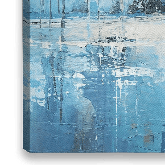 Dit schilderij vangt de verbeelding met zijn expressieve landschappen van blauwe en witte palmbomen tegen een achtergrond van licht turquoise water. De kunstenaar heeft palette messen op een gedurfde manier gebruikt om de textuur en diepte van het werk te versterken, en de reflecterende weerspiegelingen creëren een unieke sfeer van rust…
