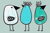 Turquoise Tones in Harmony - Dit abstracte dieren schilderij met drie gestileerde, cartooneske vogelachtige figuren op een lichte mintgroene achtergrond, elke vogel uniek gekleurd in wit en twee in turquoise, benadrukt met krachtige zwarte, dikke contourlijnen.