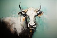 "Turquoise Verstilling" biedt een diepgaande blik op het majestueuze wezen dat we kennen als het rund. De koe staat hier niet enkel als dier, maar als een symbool van rust en reflectie. De zachte aquamarijn achtergrond contrasteert subtiel met de warme aardetinten van het rund, waardoor een visuele harmonie ontstaat die zowel kalmerend als betoverend is.