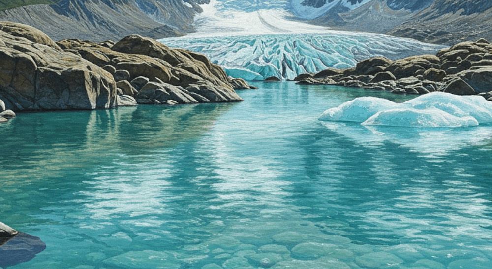 Een majestueuze gletsjer in de verte stroomt zachtjes in het bassin en creëert af en toe een drijvende ijsschots die door het kristalheldere blauw drijft. De contrasten van ruwe rotsformaties en delicaat ijs creëren tegelijkertijd dynamiek en rust. Elke blik onthult nieuwe details, van de scherpe randen tot de fijn uitgebeitelde structuren van de gletsjertong, die het kunstwerk spanning geven.