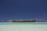 Palmeneiland in turquoise ze in de lagune van Aitutaki in The Cook Islands tegen een diep blauwe lucht met witte wolkjes gezien vanaf een zandbank.