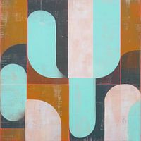 Strakke, geometrisch-abstracte compositie die is opgebouwd uit afgeronde vormen, verticale stroken en overlappingen. Het kleurenpalet is opvallend doch harmonieus: turquoise, zachtroze, mosterdgeel, diepzwart en vleugjes koperrood vormen samen een gelaagd visueel ritme. De textuur is licht verweerd, waardoor het schilderij ondanks zijn…