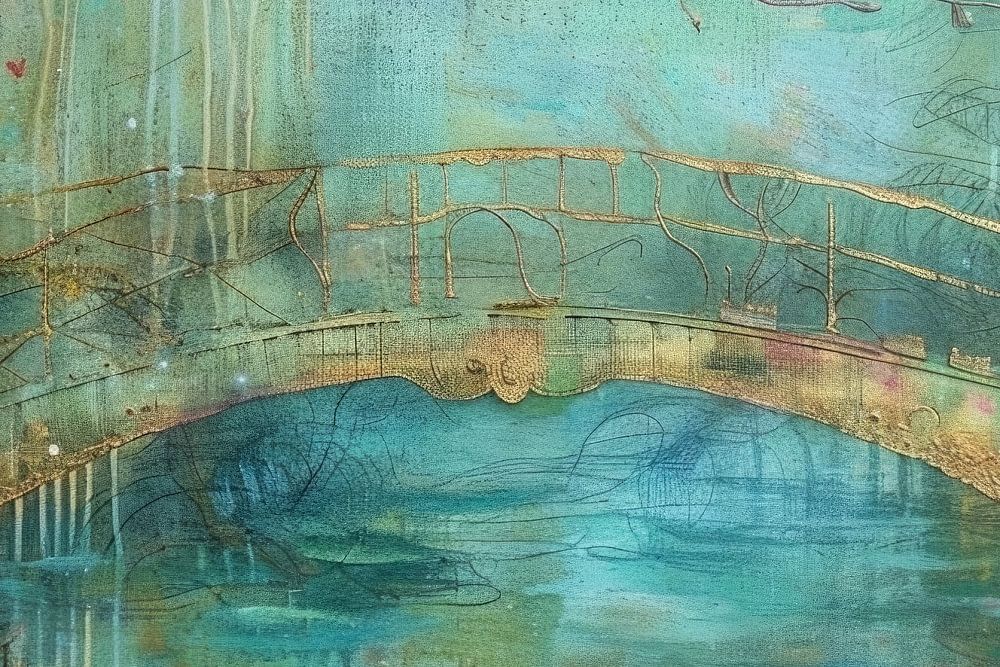 Een abstract schilderij in turquoise tinten met een gouden brug en bloeiende accenten straalt een impressionistische en poëtische sfeer uit. Een tijdloos abstract werk, geïnspireerd door Claude Monet, dat rust en romantiek oproept.