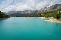 Uitzicht op het stuwmeer van Guadalest. Turkoois water ontmoet een majestueus berglandschap en een bewolkte lucht. Guadalest wordt beschouwd als een van de mooiste bestemmingen in het bergachtige achterland van de provincie Alicante in Spanje. Het historische bergdorp Guadalest trekt veel bezoekers met zijn historische kastelencomplex.…