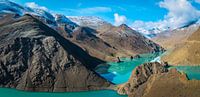 Turquoise water van het heilige Yamdrok meer in Tibet. Een indrukwekkend landschap, prachtige, bijna onwerkelijke kleuren, besneeuwde bergtoppen. Het verstilde landschap van Tibet. Het is een van de grootste heilige meren.
