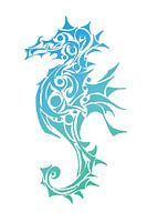 decoratief kunstwerk van een klein turkoois zeepaardje in tribale tatoeagestijl.