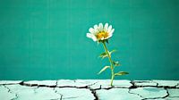 Deze afbeelding toont het verbluffende beeld van een enkele bloem die moedig groeit uit een gescheurde, droge ondergrond. De frisheid van de bloem met haar delicate witte blaadjes en opvallende gele kern staat in sterk contrast met de gebarsten, turquoise oppervlakte.