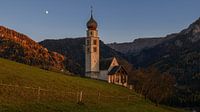 De avond daalt neer over het dal, en het laatste zonlicht strijkt nog eenmaal langs de hellingen. De kleine Chiesa di San Valentino vangt de warme gloed van de ondergaande zon, haar witte muren en ui-vormige torenspits lichten zacht op tegen de schaduw van de donkere bergflanken.
