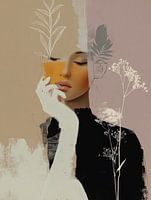 Een portret dat speelt met contrast en stilte. Zachte kleuren, strakke lijnen en florale elementen komen samen in een moment van introspectie. De gesloten ogen en hand bij het gezicht geven het gevoel van even pauzeren — stilstaan tussen gedachten. De mix van realisme en abstracte vormen maakt het krachtig en tegelijkertijd kwetsbaar.