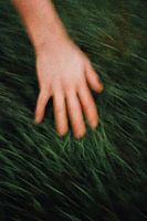 Een zachte hand glijdt door wuivend gras, vastgelegd in een dromerige, korrelige stijl die aanvoelt als een herinnering. Deze poëtische compositie vangt de pure verbondenheid tussen mens en natuur in één intiem gebaar.
