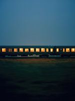 Een trein snijdt door het vlakke landschap terwijl de avond valt. Buiten vervaagt de wereld tot strepen van gras en schaduw; binnen gloeien de ramen warm en stil, als kleine eilanden van leven in een bewegende doos. Het contrast is scherp maar zacht tegelijk: koude blauwtinten van de schemering tegenover het amberkleurige licht van…
