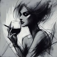 Een vrouw zit ontspannen met een glas wijn, haar blik afwezig maar betekenisvol. In houtskool en grijstinten wordt een moment van stille overgave vastgelegd. De compositie ademt rust, kwetsbaarheid en kracht tegelijk. Licht en schaduw spelen subtiel over haar contouren. Een beeld dat blijft hangen, als een fluistering in de schemering.