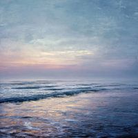 In dit verstilde kustlandschap ontmoet het eerste licht van de dag de zachte beweging van de zee. De horizon ligt laag en open, gehuld in een dunne nevel die lucht en water met elkaar verbindt. Blauwe en pastelroze tinten weerspiegelen in het natte zand en volgen het rustige ritme van de golven. Het beeld voelt ruim en ademend, alsof de…