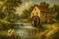Dit werk toont een betoverend landschap waar natuur en geschiedenis in stilte samenkomen. Een rustieke stenen watermolen staat aan de oever van een helder stromende rivier, het water kabbelt rustig over de lage waterval en laat het houten rad langzaam draaien. De omliggende bomen filteren het zonlicht in warme gloed. Aan de voorgrond…