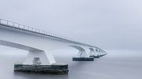 Op deze foto staat de imposante Zeelandbrug centraal — een moderne, minimalistische constructie die zich als een witte lijn uitstrekt over het kalme water van de Oosterschelde. De brug rust op een reeks gelijkmatig geplaatste betonnen pijlers, strak en geometrisch, die samen een ritmisch patroon vormen dat het oog meeneemt naar de…