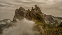 De wolken trekken langzaam open als gordijnen van licht, en daarachter verschijnen de ruwe pieken — scherp, oud, en onaangedaan door tijd. De bergen rijzen op uit een zee van mist, als wachters van steen die de stilte van eeuwen bewaren. Hun flanken glanzen vaal in het zwakke zonlicht, waar hier en daar een strook groen zich vastklampt aan de rotsen, als leven dat weigert te wijken.