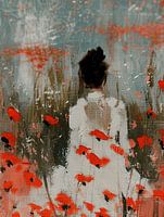 Tussen de klaprozen, portret van een jonge vrouw, op de rug gezien, in een veld vol met klaprozen. Grove structuur. Hiermee haal je de lente én zomer in huis!