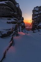 Rotspartij in de zonsondergang op de Dreisesselberg, Beieren, Duitsland