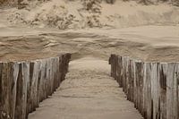 De strekdammetjes op het strand. Met uitzicht op de duinen.