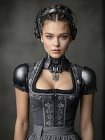 Dit portret toont een figuur die bewust op het raakvlak tussen menselijke gratie en technische precisie is geplaatst. De blik is open, kalm en recht op de kijker gericht. Ze lijkt niet veeleisend of onderdanig, maar aandachtig, bijna nieuwsgierig. Er zit een subtiele irritatie in deze openheid: de uitdrukking is vertrouwd, maar blijft…