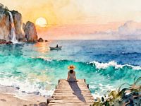 Een stil moment tussen verlangen en uitgestrektheid: aan het einde van een smalle houten steiger zit een vrouw met een strohoed en kijkt uit over de turquoise zee. Zachte golven breken in het warme licht van de zonsondergang, terwijl de gouden zon in het water weerspiegelt. In de verte glijdt een kleine boot over de rustige zee, vlakbij…