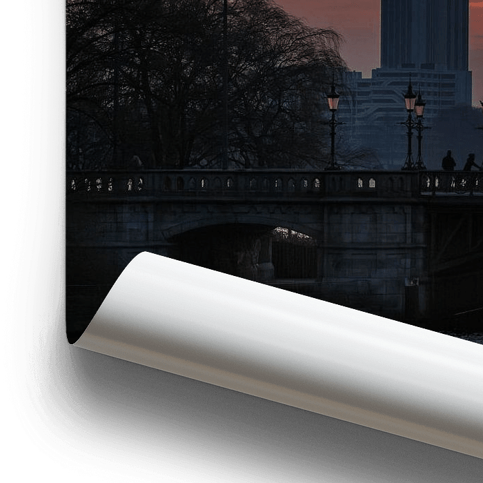 Een gouden zonsondergang op de Alster in Hamburg baadt de stad in een warm licht. De brug, vol met wandelaars en fietsers, strekt zich uit als een stille getuige tussen natuur en stedelijkheid. De rivier weerspiegelt de kleuren van de lucht, terwijl de silhouetten van bomen en torens een vredige achtergrond vormen. Een moment van rust…