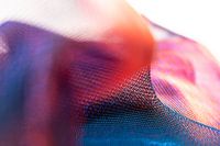 Dit werk toont een abstracte close-up van een fijn geweven stof met een vloeiend kleurverloop van rood, blauw en violet. De structuur van het materiaal is duidelijk zichtbaar - de stof lijkt bijna technisch, maar tegelijkertijd zacht door de zachte overgangen van de kleuren. Het vouwen van de stof creëert subtiele zones van licht en schaduw die diepte en ritme geven aan het beeld. In de onscherpe gebieden worden zachte cirkels van licht gecreëerd door een gerichte scherptediepte - een fotografisch stijlmiddel dat bekend staat als bokeh. Het wordt hier niet gebruikt om een onderwerp af te beelden, maar om het terug te brengen tot licht, kleur en structuur.