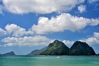 Op het kalme water van El Nido vaart een traditionele boot op het ritme van de golven. De heuvels van een eiland op de achtergrond worden onthuld in een palet van groen, als eerbetoon aan de natuurlijke schoonheid van deze hoek van de Filippijnen.