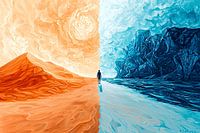 Dit unieke kunstwerk toont een surrealistisch tafereel waarin een menselijk silhouet balanceert tussen een vurige woestijn en een ijskoude, blauwe bergwereld. Het ontwerp vangt de essentie van dualiteit, harmonie en contrast in één beeld. De levendige kleuren en krachtige vormen maken het een perfecte blikvanger voor elk modern interieur. Dit kunstwerk straalt energie en evenwicht uit, wat het een ideale keuze maakt voor ruimtes waarin inspiratie en reflectie samenkomen. Denk aan een kantoor, slaapkamer of creatieve werkruimte.