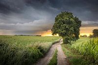Het slingerende pad, de grote boom en de maïsvelden vormen samen een typisch Zuid-Limburgs tafereel. Wat deze foto voor mij bijzonder maakt, zijn de kleine details: de regensluiers in de verte, het frisse groen, en de paar paarse bloemen die net zichtbaar zijn tussen het gras. Geen grootse scène, maar juist die combinatie van eenvoud en spanning maakt het krachtig.