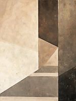 Rechthoeken, driehoeken en diagonalen vouwen zich over elkaar als muren zonder plafond. In de tinten zit een warme neutraliteit — bruin, beige, off-white.