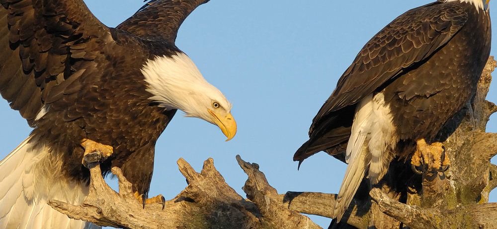 Twee Amerikaanse zeearenden neergestreken op de tak van een dode boom op het strand van de Homer Spit dichtbij Homer aan de Kachemak-Baai in Alaska.