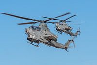 Twee Bell AH-1Z Viper gevechtshelikopters komen binnen om te worden bijgetankt op NAF El Centro.