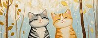 Twee Blije Katten - Op dit schilderij zie je twee vrolijke katten, een grijze en een oranje, die met een blije uitdrukking samen in een tuin met herfstbladeren staan, omringd door zachte kleuren die een zomerse sfeer uitstralen.