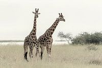 Twee Giraffen in hoog gras met op de achtergrond de rivier de Nijl. Foto is in Uganda gemaakt en het is een highkey.