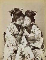 Twee Japanse meisjes in kimono. Vintage foto in zwart-wit.