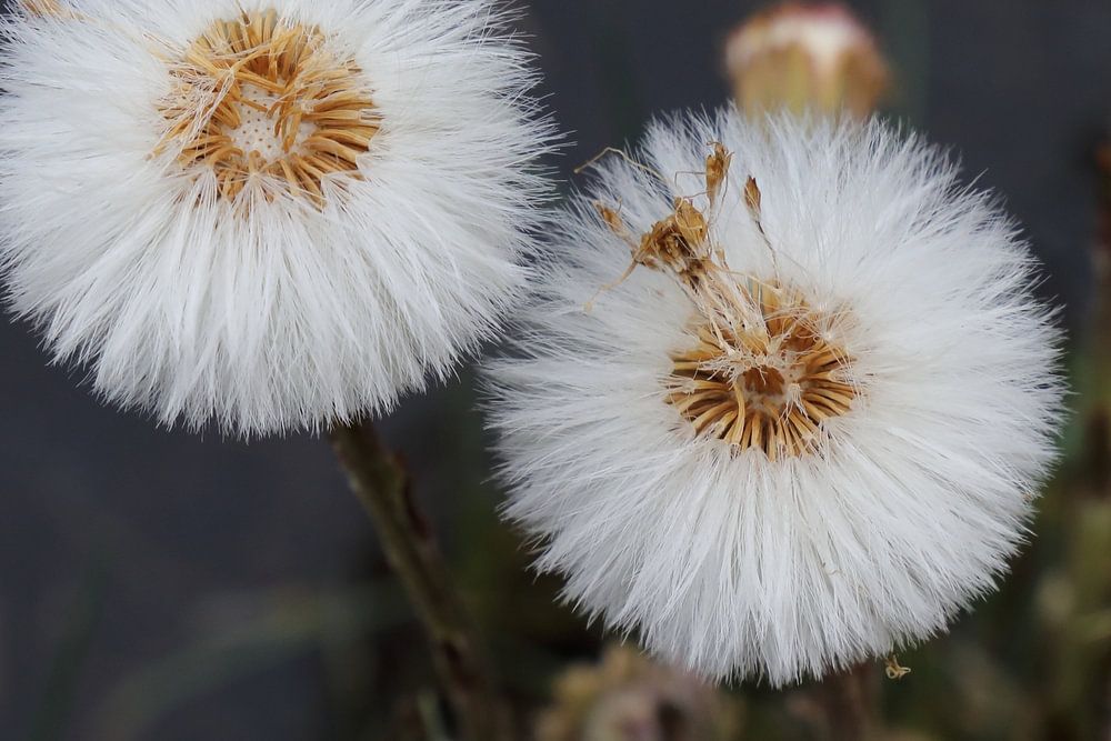 Twee pluisbloemen staan in stille zachtheid bij elkaar, hun fijne witte draden licht oplichtend tegen de donkere achtergrond. De fragiele structuur van de zaden vormt een bijna etherische bol, alsof ze elk moment kunnen wegzweven op een zuchtje wind.