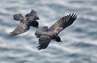 Twee buitelende Raven in vlucht over de Atlantische ocean in noord Noorwegen.