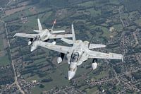 Twee McDonnell Douglas EF-18A Hornets van de Spaanse Luchtmacht air-to-air boven België gefotografeerd op 7 september 2018 tijdens een air-to-air fotoshoot.