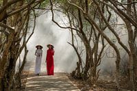 Twee Vietnamese vrouwen lopen tussen de Mangrove bomen in de vroege ochend in hun traditionele kledij (Aodai). Foto genomen bij Hue in Vietnam.