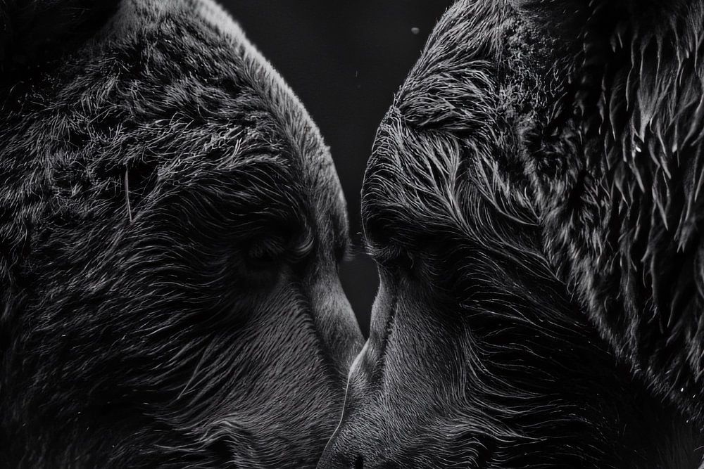 Dit prachtige zwart-wit ontwerp toont twee beren die elkaar liefdevol aankijken in een donkere omgeving. Het beeld is indrukwekkend door zijn eenvoud en de gedetailleerde weergave van de berenvacht. Perfect voor liefhebbers van natuur en dieren, brengt dit kunstwerk een gevoel van rust en sereniteit in elke ruimte. De monochrome kleuren zorgen ervoor dat het ontwerp naadloos past in zowel moderne als klassieke interieurs. Hang het in je slaapkamer, kantoor of woonkamer om een vleugje natuur en elegantie toe te voegen. Dit kunstwerk is een eerbetoon aan de majestueuze schoonheid van beren en hun serene aanwezigheid in de wildernis.