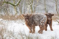 Twee kalfjes van Schotse Hooglanders in het bos tijdens een sneeuwstorm in Nederland. Er bleef flink wat sneeuw op de vacht liggen.