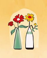 Minimalistisch stilleven van een rode en een gele bloemen in twee kegelvormige vazen. Achter de vazen voegt een langwerpige halve cirkelvorm in lichtgele kleur diepte en dimensie toe aan het kunstwerk.