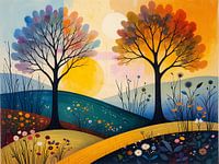 Twee majestueuze bomen staan naast elkaar terwijl de zon langzaam ondergaat en de lucht kleurt in levendige kleuren oranje, roze en paars.