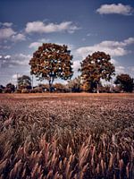 Dompel jezelf onder in de vredige schoonheid van de natuur met dit unieke motief, dat verkrijgbaar is als hoogwaardige print van artheros. De afbeelding toont een uitgestrekt veld met rijp graan, waarvan de zachte beweging in de wind een rustgevende sfeer creëert. Majestueuze bomen op de achtergrond voegen diepte en karakter toe aan het werk, terwijl de lucht met zijn schilderachtige wolken een bijna poëtische stemming creëert.