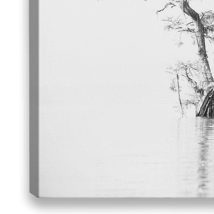 Twee Cypress Swamps (bomen) in het water in de moerassen van Louisiana. Zwart-wit waardoor het een Japanse pentekening lijkt