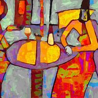Twee lunchende dames die aan een tafeltje zitten met daarop een wijnglas en wijnfles. Geschilderd in vrolijke kleuren. Stijl: abstract impressionistisch. Format: vierkant.