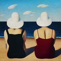 Het is duidelijk zomer en deze twee dames genieten van een dagje strand. Ze dragen badkleding en beschermen zich tegen de zon met een witte hoed. Dit is een beeld dat iedereen zal herkennen en daarom altijd herinneringen oproept