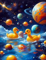 In een grillige scène drijft een levendig badeendje sereen op een uitgestrekte ruimteoceaan, omringd door een betoverend tapijt van sterrenstelsels en fonkelende sterren. De kosmische golven kabbelen zachtjes en weerspiegelen de kleurrijke tinten van verre nevels, terwijl het badeendje met zijn felgele buitenkant en vrolijke houding een speels tintje toevoegt aan de hemelse achtergrond. Dit betoverende beeld combineert de onschuld van de kindertijd met de grenzeloze wonderen van het heelal en nodigt kijkers uit om te dromen en de fantastische mogelijkheden van de ruimte te verkennen.
