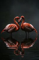 Dit prachtige ontwerp toont twee elegante flamingos die elkaar diep in de ogen kijken terwijl ze in een kalm water staan. De reflectie van de flamingos in het water voegt een extra dimensie toe aan dit serene tafereel, wat het tot een adembenemend kunstwerk maakt. De diepe, rijke kleuren en het spel van licht en schaduw zorgen voor een visueel indrukwekkende ervaring. Dit kunstwerk is een perfecte aanvulling voor elke moderne woonkamer of kantoorruimte, waar het een gevoel van rust en elegantie zal brengen. Laat je betoveren door de schoonheid van de natuur en de verfijnde details van deze majestueuze vogels.